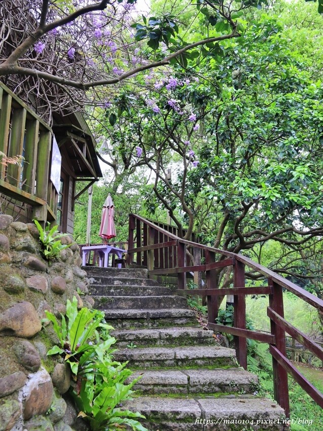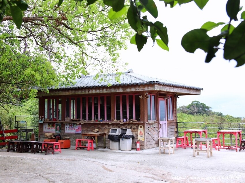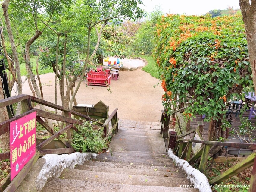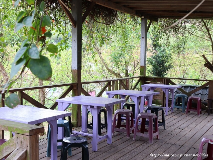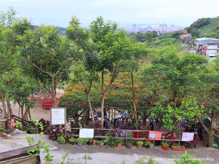 一走上來先看到涼亭式的座位,在種滿炮杖花的涼亭下坐著,有著幸福感