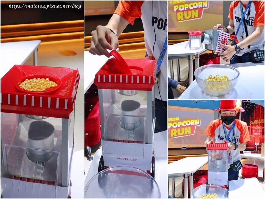 使用小型爆米花機器,將爆米花倒入後沒多久就陸續爆出一顆顆爆米花