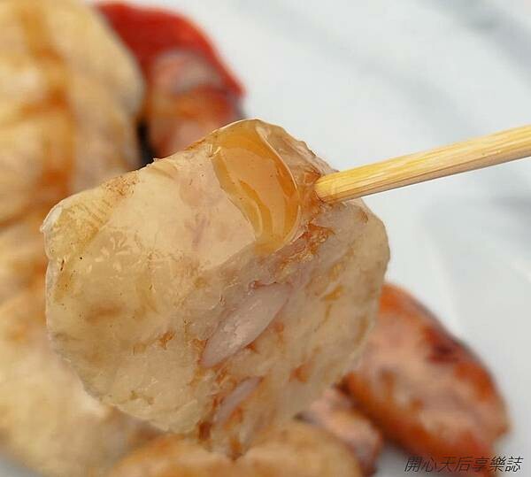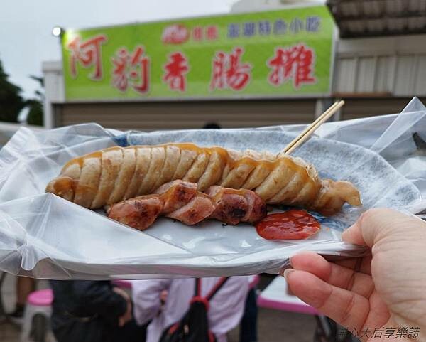 走到澎湖天后宮附近的阿豹香腸攤,攤販前果然有人潮,點了碳烤香腸$20和秤重的糯米大腸$65,加了甜辣醬,坐著慢慢吃