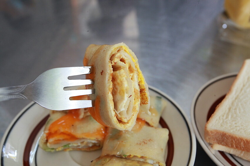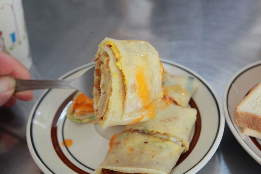 這蛋餅餅皮是使用麵糊下去製作的,這樣蛋餅份量足定價很便宜。