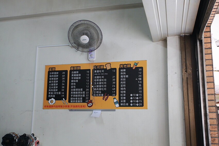 牆壁上有貼上菜單供顧客點餐參考,菜單有蛋餅類、吐司類、饅頭類及其他類等,菜單品項很多可供選擇定價偏平價。