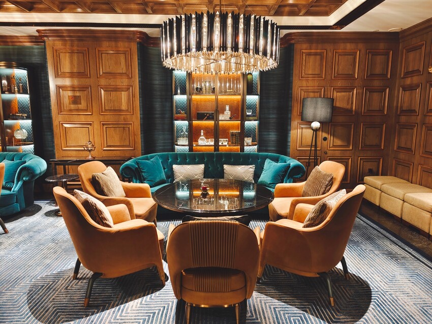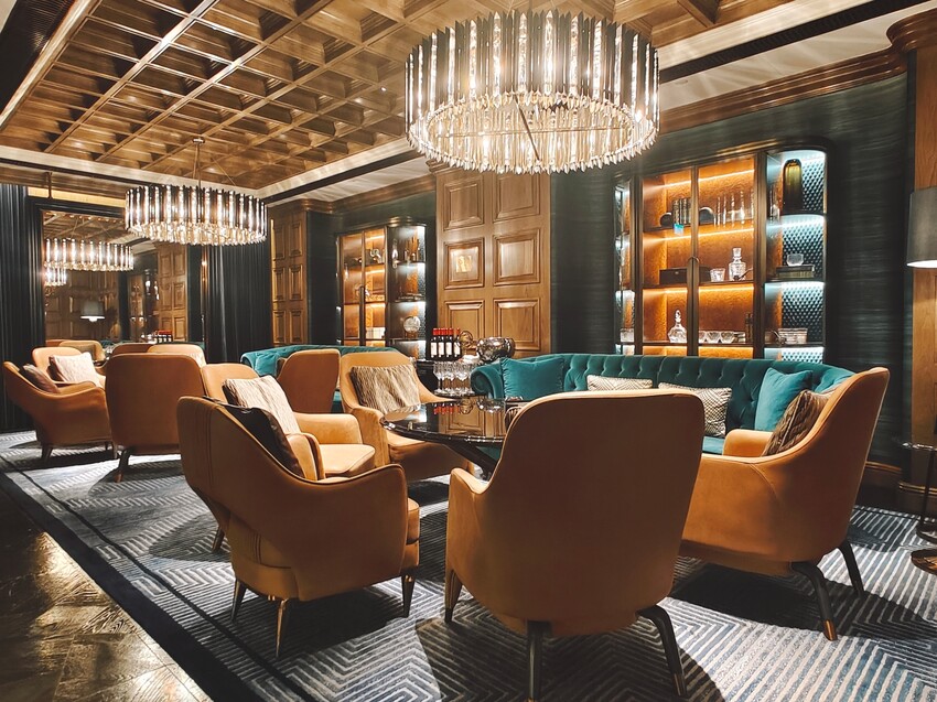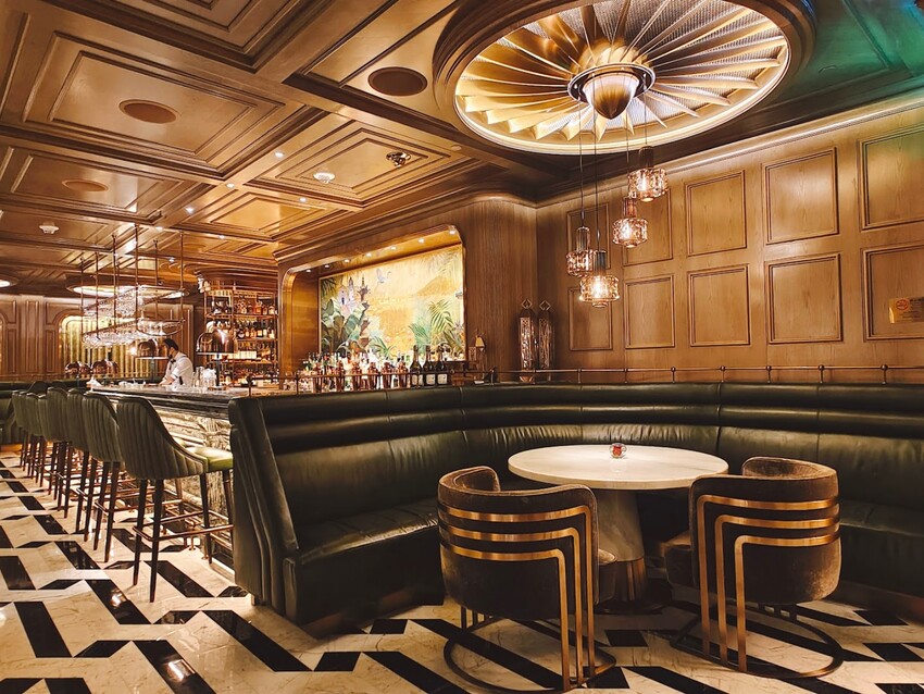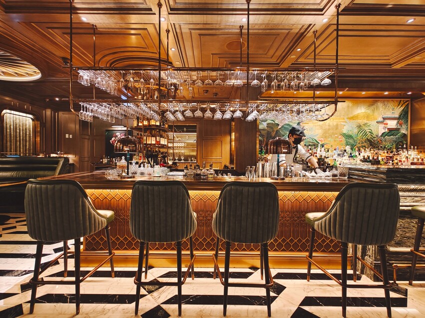 ▼瑞吉酒吧是香港知名建築師梁志天設計,看了一些他的作品,瑞吉酒吧算是他作品中相對華麗的,我覺得他很擅長在簡約的空間裡用燈飾、家具、光影佈建出輕奢質感,建材、圖騰的選用都富有內涵,並且會根據當地建物及其背景融入文化與藝術。