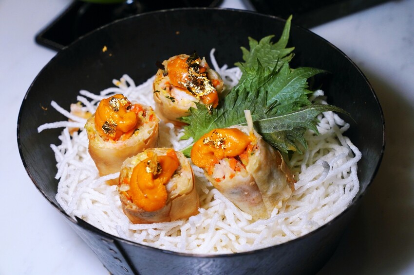 春捲包了蔬菜、脆甜蝦肉,料豐富實在,放上鹹鮮的海膽,吃來底韻甘甜順口。
