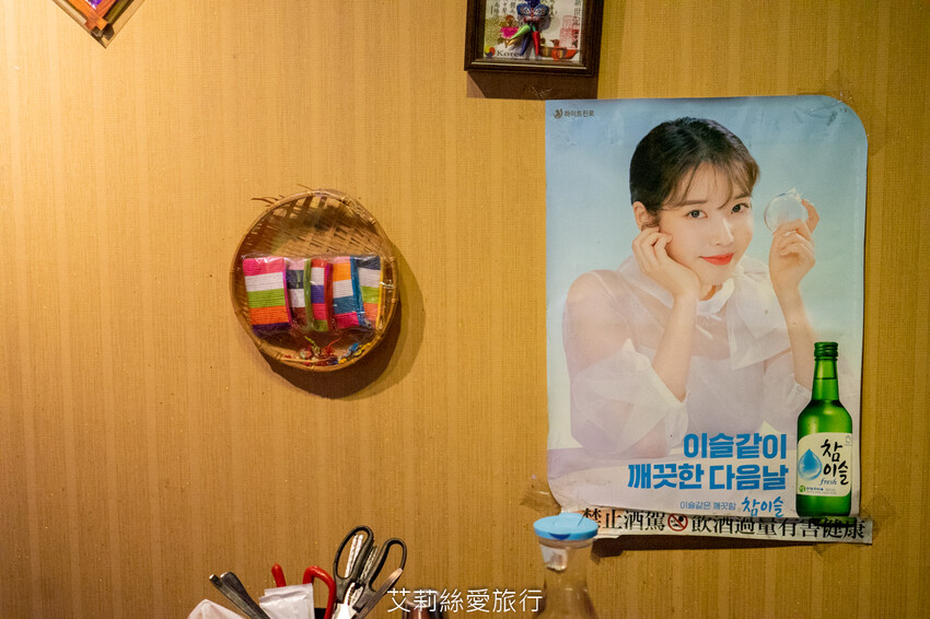 甘釜京店內佈置大量使用IU代言的真露燒酒空瓶,