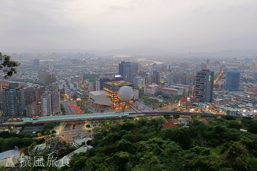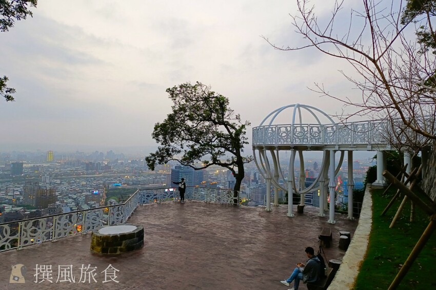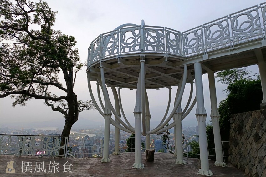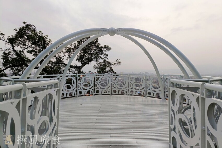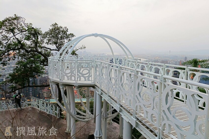 北眼平台的純白設計儼然成為熱門打卡點,因外型圓球狀因此又被網友親切的稱呼為「貢丸平台」或「北眼貢丸」,剛好與北藝中心外型形似頁豆腐、豬血糕和貢丸的組合呼應,撰風個人覺得稱呼為貢丸平台更好一些,因為可以順道推廣了士林夜市街邊美食的特色。北眼平台的眺望感更好一些,不過視野上會被前方的樹擋到,所以希望廣一點的風景,可以到微風平台拍攝。雖然這棵樹有點擋到畫面,不過我覺得有點綠意是加分的,而且樹的形狀蠻有詩意的。