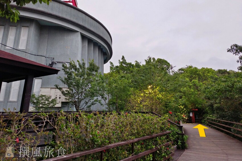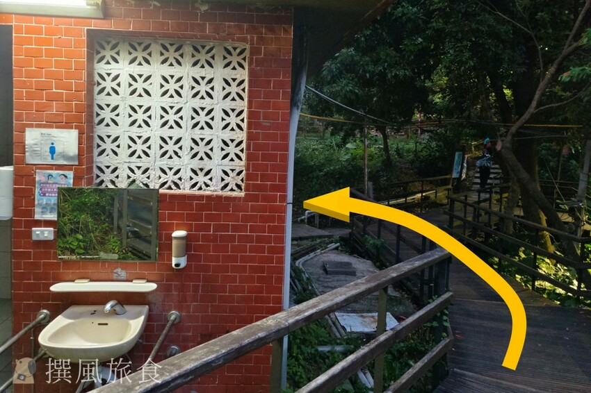 - 在中央廣播電臺圓山微波站繼續往前走一點點會有一間廁所,請在廁所旁的柵欄開口進入即可抵達北眼平台與微風平台