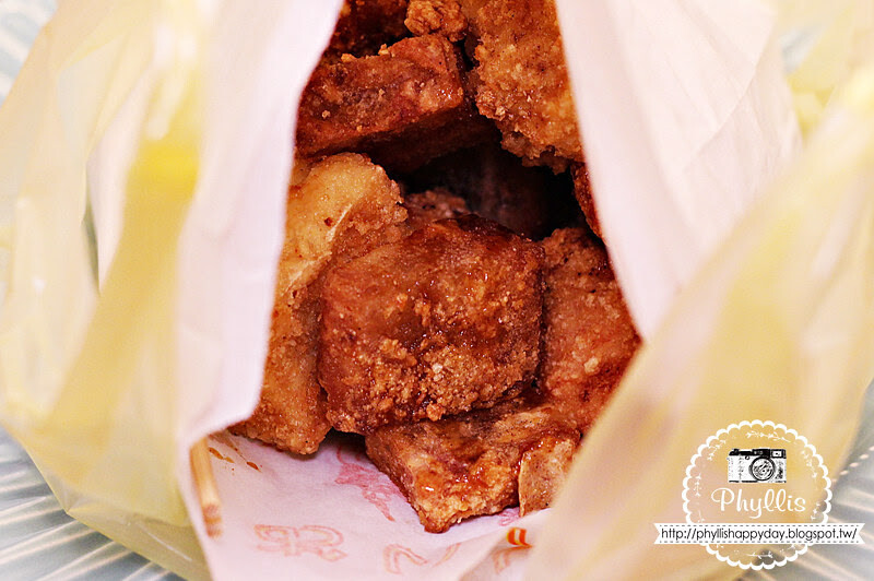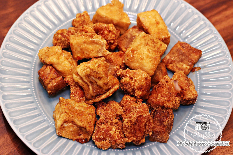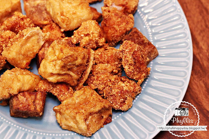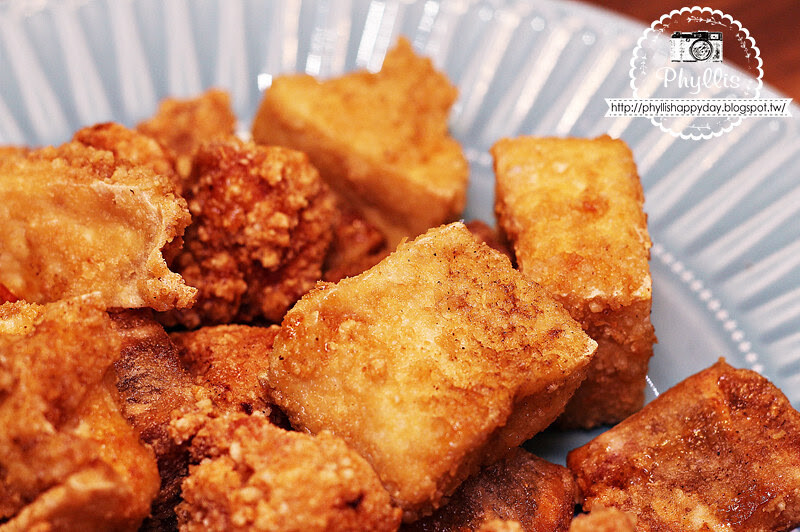 這些炸物分別是無骨鹹酥雞、炸板豆腐、甜芋籤