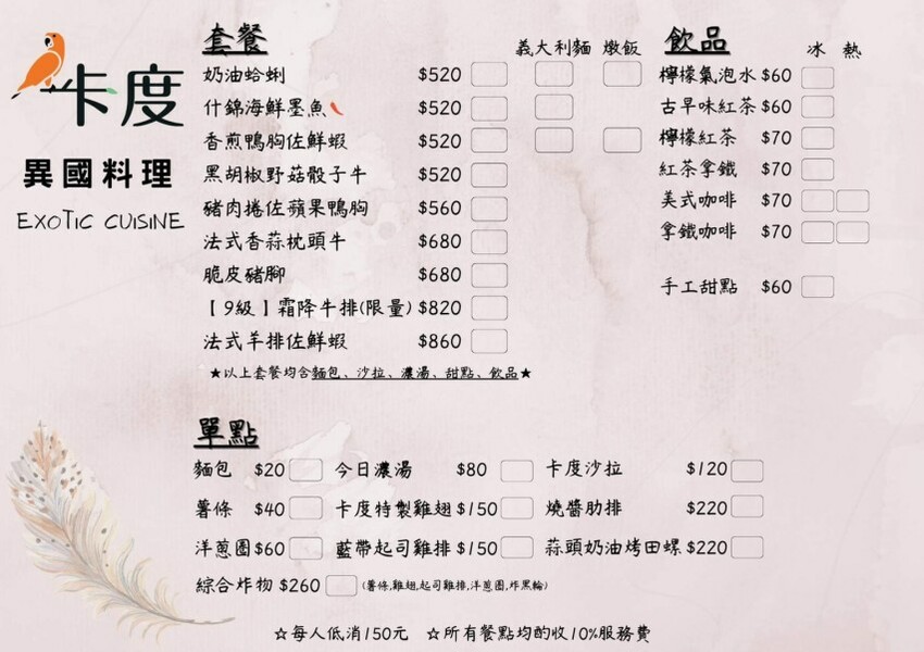 主餐有義大利麵、燉飯,可升級套餐+100元(濃湯、沙拉、60元飲品)