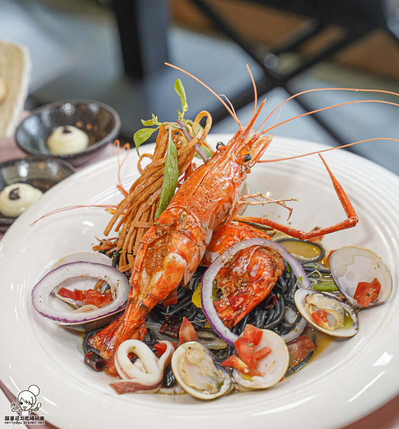 我個人超推薦的什錦海鮮墨魚,會搭配兩尾泰國蝦