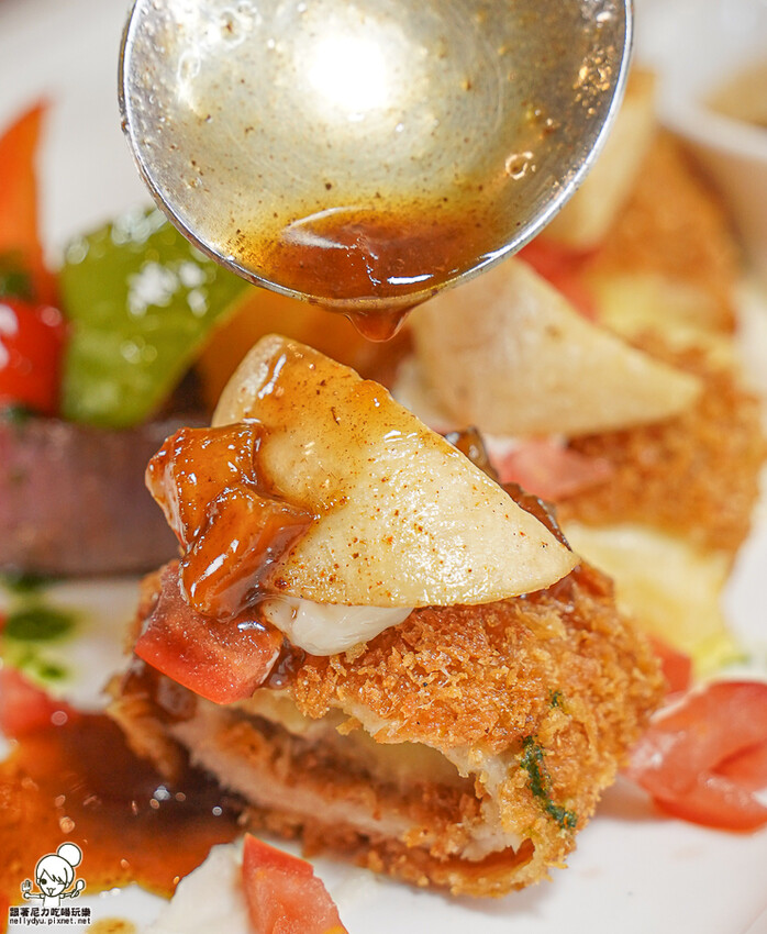 可以搭配杏鮑菇、馬鈴薯泥一起吃,感受卡滋酥脆與起司香堆疊,保有豬肉本身香甜度