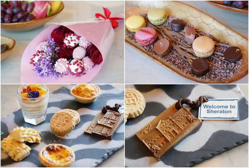 ▼玫瑰花束內的花卉都是真花,巧克力球內包著新鮮草莓。葡式建築圖樣的巧克力放了很久都捨不得吃,最驚喜的是不用去「最香餅家」排隊,也能吃到杏仁餅。馬卡龍、巧克力底下墊著的巧克力碎片一樣都是可以吃的喔!