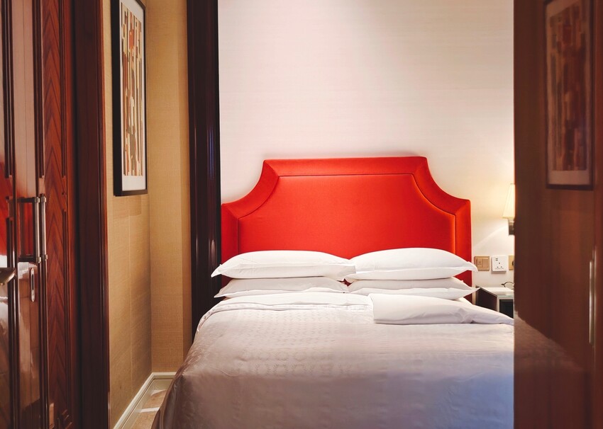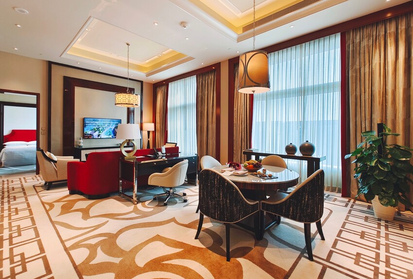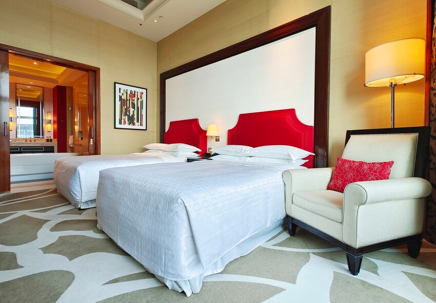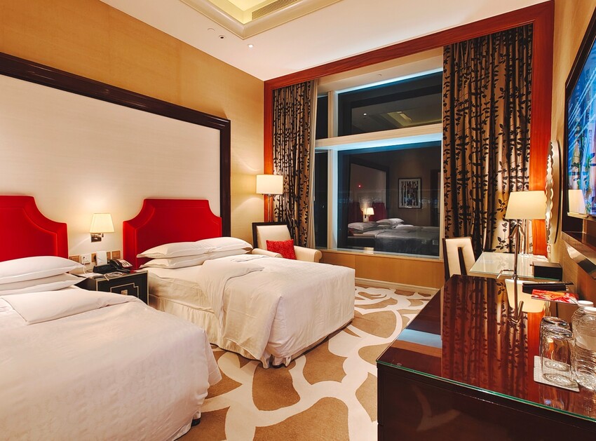 ▼喜來登酒店豪華套房的房間有 1 張大床與 2 張雙床房型,大床房最多入住 3 位 / 雙床房最多入住 4 位,即使 4 人住,空間也綽綽有餘,豪華套房的房型在指定曾有提供連通房,有需要可在預定之前詢問飯店。