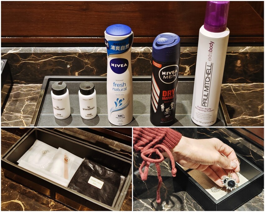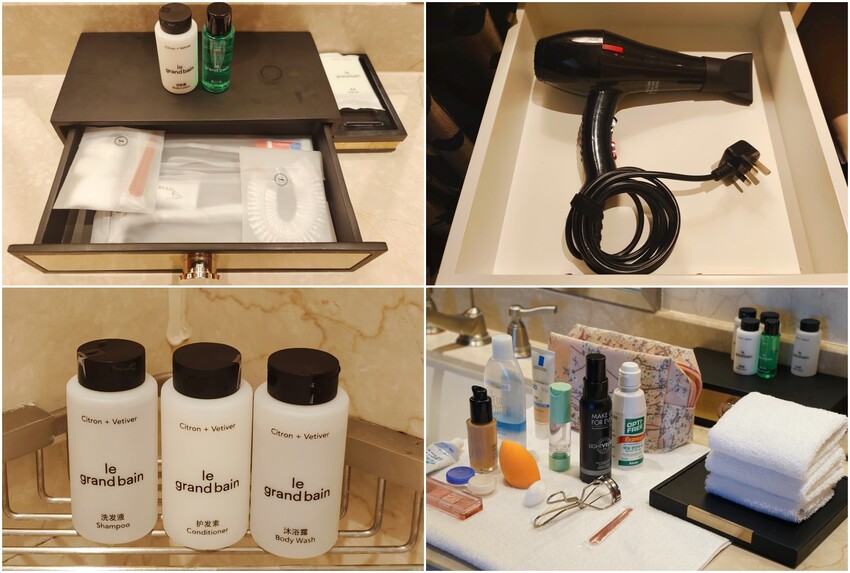 ▼沐浴用品採用喜來登自家推出的 Le Grand Bain 洗護系列,是與香氛品牌 Byredo 創辦人Ben Gorham合作的產品,有柑橘和香根草的味道,洗了不澀不黏膩,我帶回家洗了一陣子。吹風機功能不差,但稍嫌笨重。在開夜床時,浴室擺的瓶罐同時幫忙排整齊了。