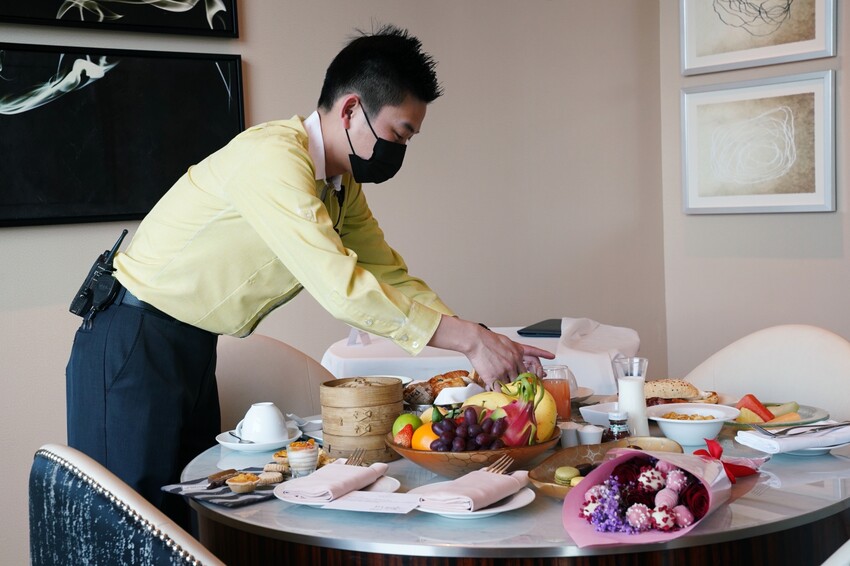 ▼在超過四千間房的澳門喜來登住兩晚,吃早餐的盛宴餐廳在 1 樓,我們住在 41 樓,得從 40 樓轉乘電梯,需要走比較遠,所以其中一天早餐就選擇 room service ,掃 qr code 線上點餐,分別點了中式早餐 248 MOP、早晨全餐 298 MOP。