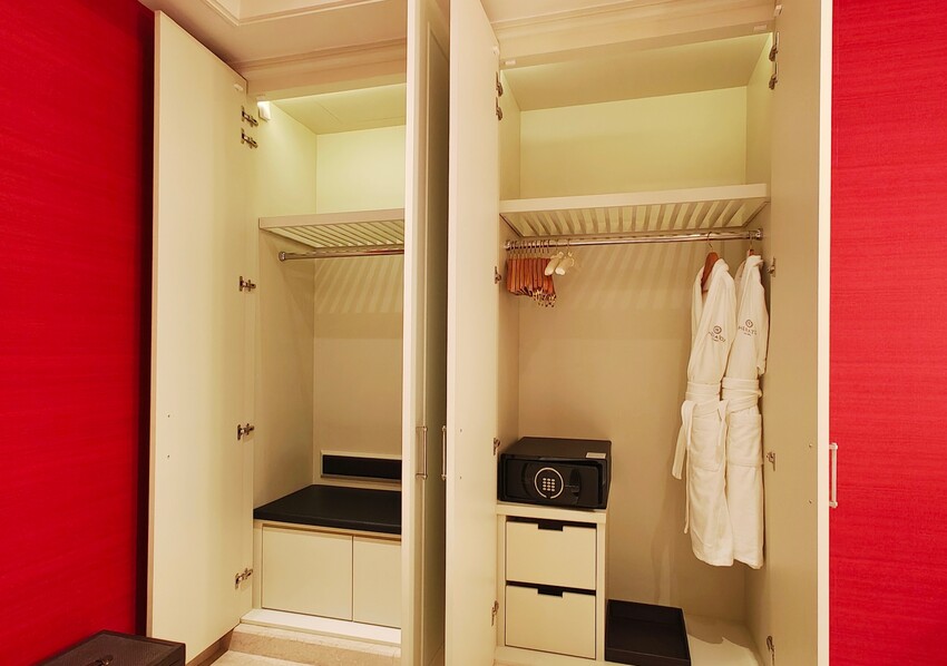 ▼衣櫃內擺放洗衣袋、紙袋、保險箱、拖鞋、浴袍、鞋拔、皮鞋刷,還有很多人不願面對的體重計。