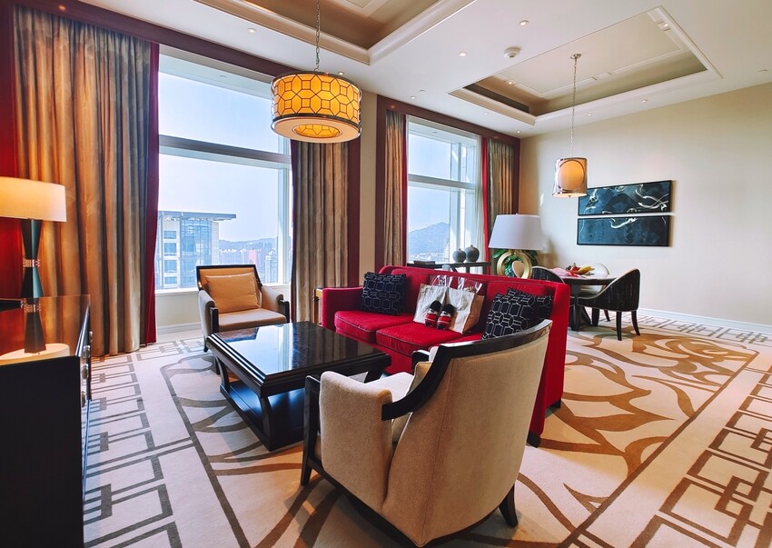▼澳門喜來登大酒店的豪華套房面積達 1,345 平方英尺,換算有 38 坪左右,比很多人住的公寓大樓來得大間了!加上挑高的空間,能短暫過個豪宅夢。