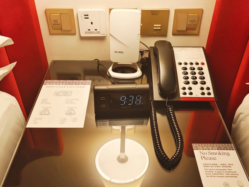 ▼床頭、鬧鐘也各有兩個 USB 插槽與一台 Aruba 廠牌的室內型 AP ,Aruba 市售大約要八千多塊台幣,一個房間還放兩台。夜燈、主控燈、房間的燈、房間的燈一併配置,房間、浴室燈都能多段調整。