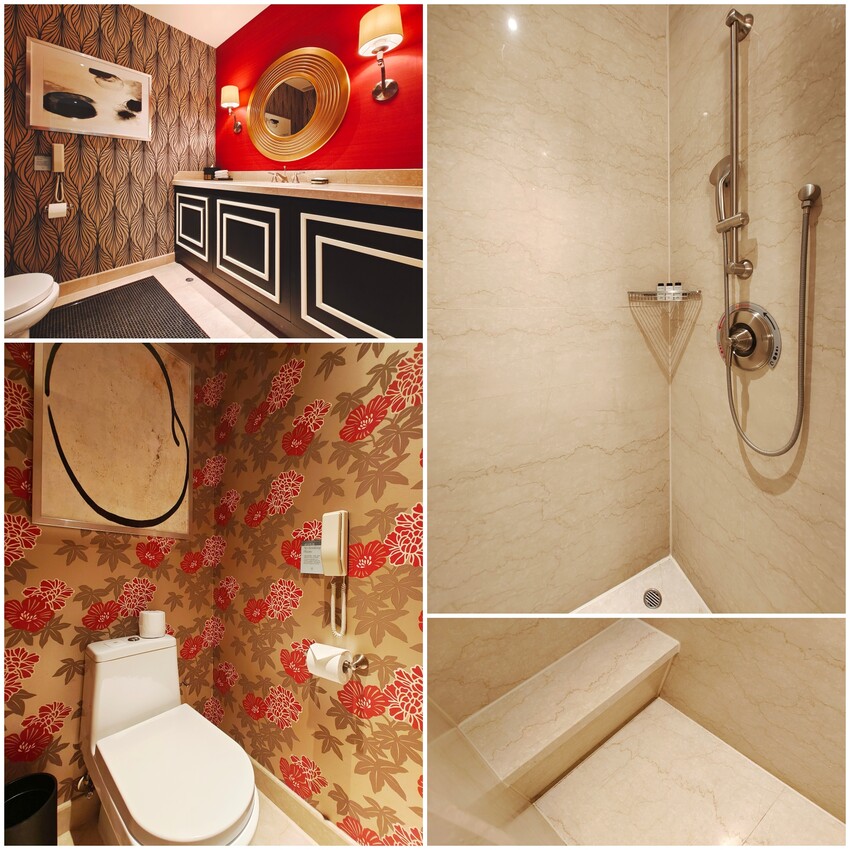 ▼廁所一共有兩間,一間是客用洗手間(左上),另一間在比較大的衛浴間(牆面花卉圖案的),所以室友在洗澡時,不用等廁所。客用廁所用色大膽有品味,照明的色溫很有氣氛。淋浴間可以坐著洗對於走一整天鐵腿者很有舒緩效果,蓮蓬頭上方亦有花灑。
