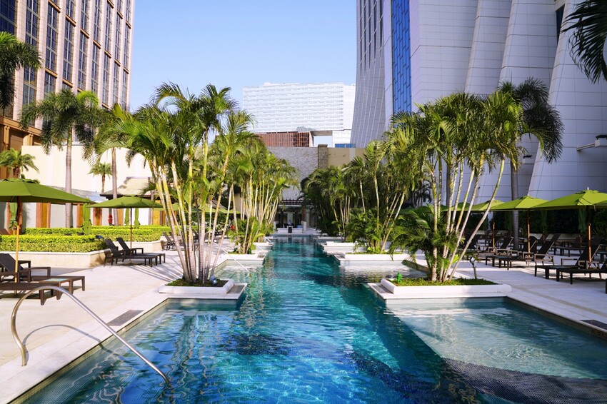 因時間的關係,我們只來了「優閑」泳池。戶外游泳池被蔥鬱的熱帶植物環繞,有海島飯店風格,但是俯瞰的路氹金光大道又很有反差。每個游泳池均設有池畔涼亭、躺椅;而池畔咖啡廳則供應小食與飲品,給客人補充能量的去處。要注意的是這裡沒有救生員,安全部分需要自行留意。
