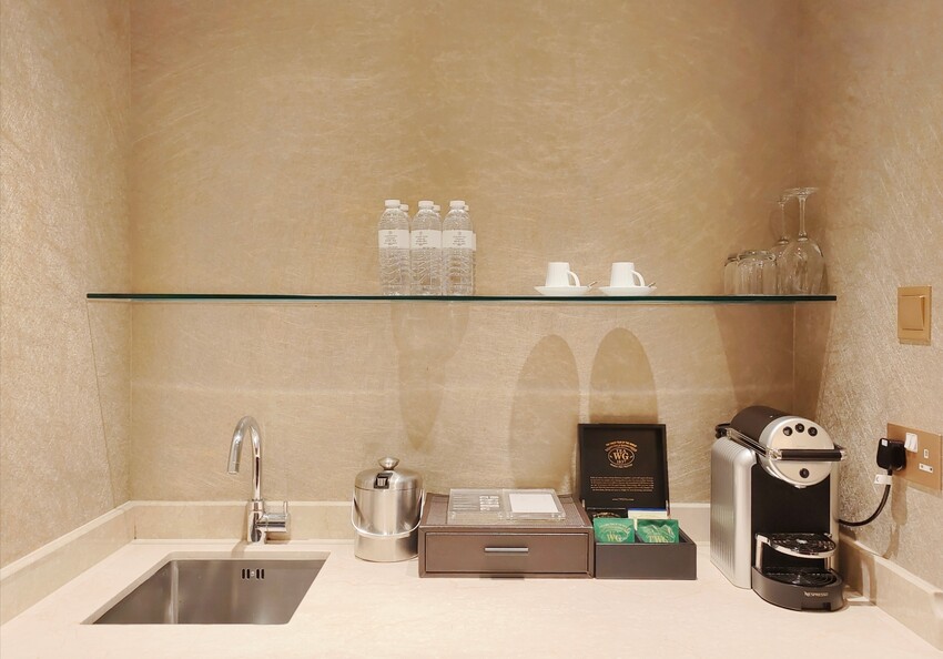 ▼客廳房邊設有流理臺,我都把迎賓水果端到這裡邊吃邊切,清理上非常方便。mini bar 也在這區,除了冰箱飲料需額外付費,其他的茶包、咖啡包、膠囊咖啡、礦泉水都免費使用,使用後也都會補上。