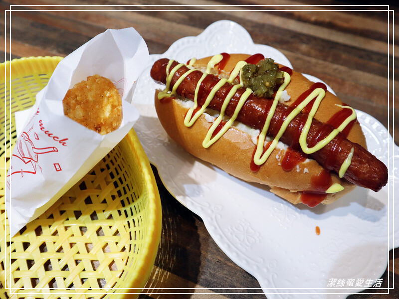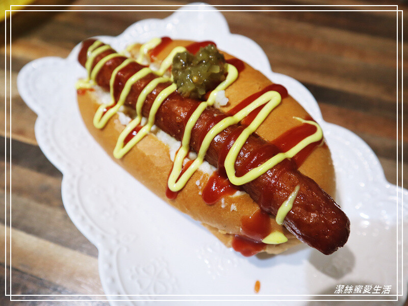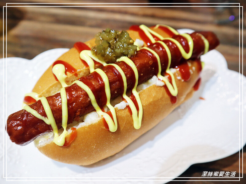 超長大熱狗超出了麵包一截XD,上面擠了芥末醬及蕃茄醬,同樣放上了一匙酸黃瓜解膩,既邪惡又誘人。