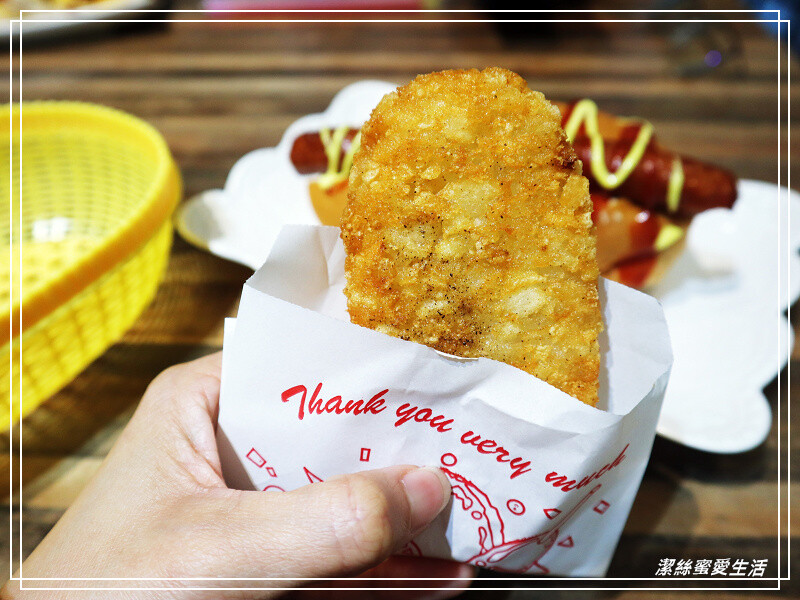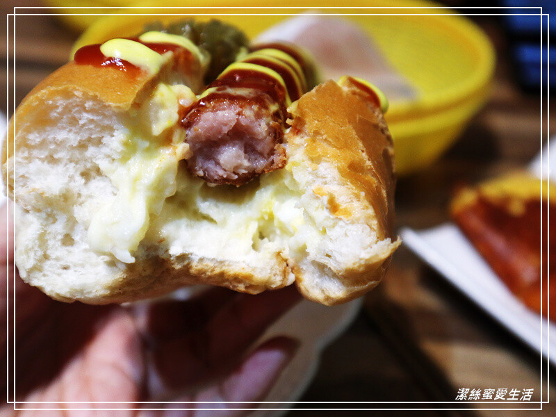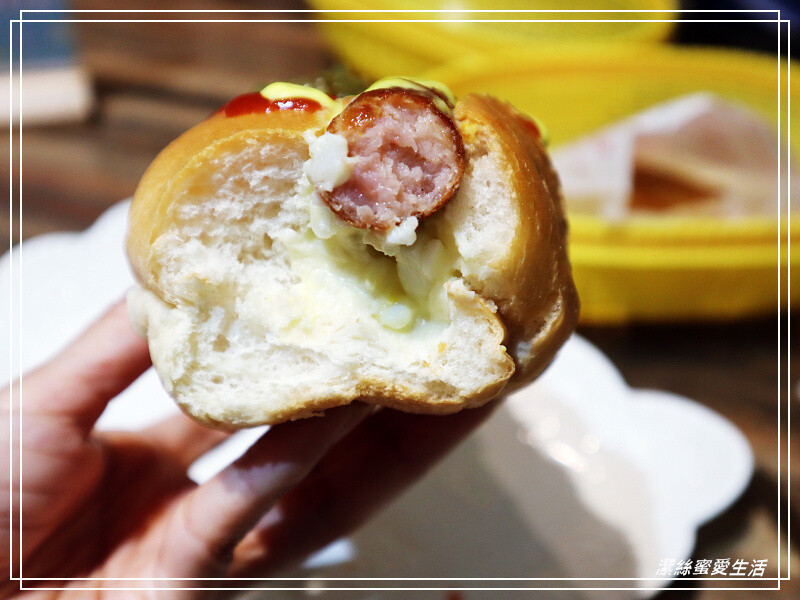 麵包體本身有厚度不空虛,吃起來表層微酥內鬆軟,夾上超巨熱狗的份量已然不小,沒想到一口咬下,中間還有洋芋沙拉,罪惡感與飽足度大大UP😂😂。