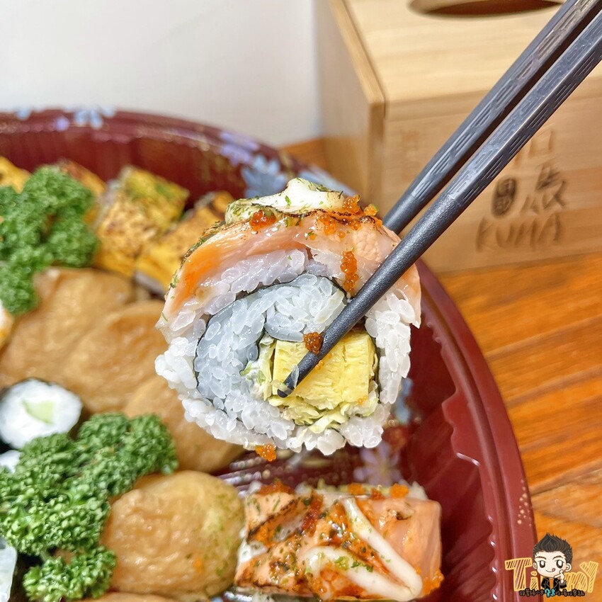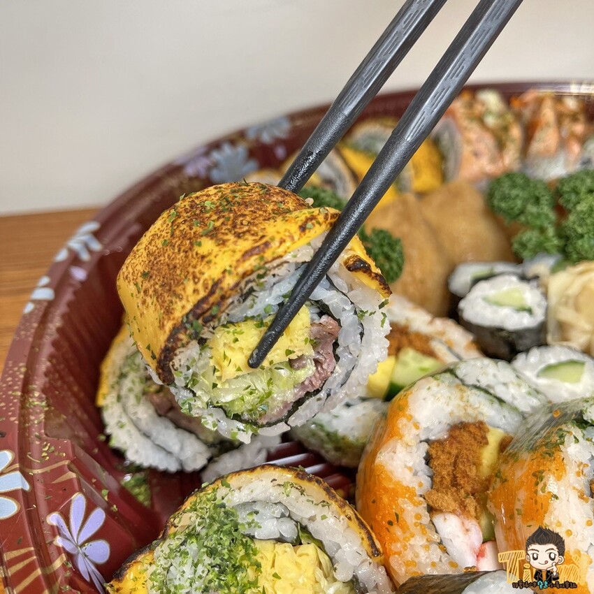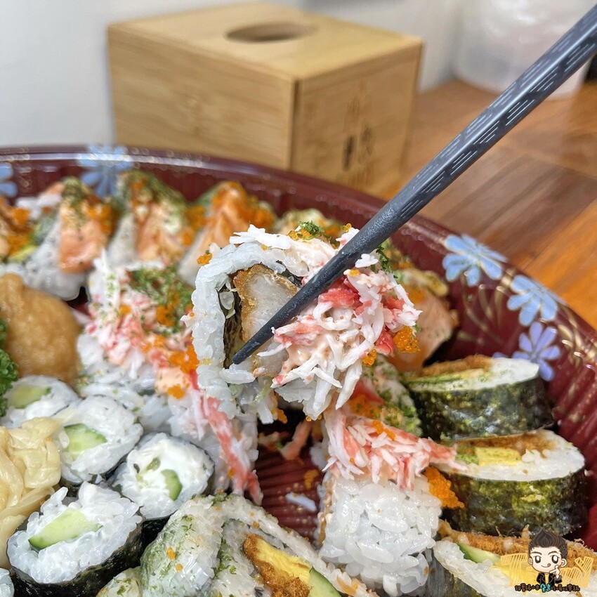 最後是團體公司舉辦活動時,很適合訂的壽司拼盤(1200元),有炙燒鮭魚壽司、和牛起司壽司、炸蝦壽司、花壽司、小黃瓜/肉鬆/蟹味細卷。