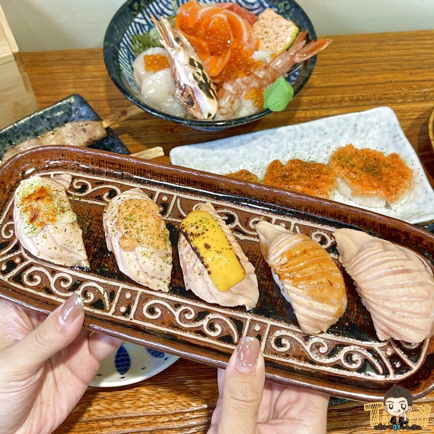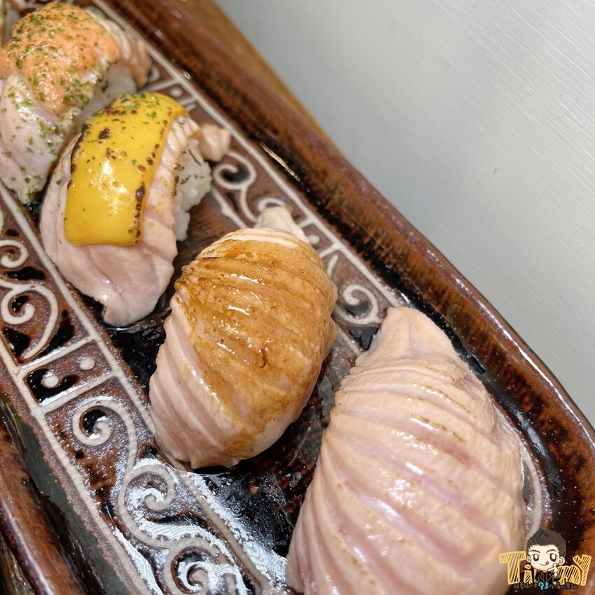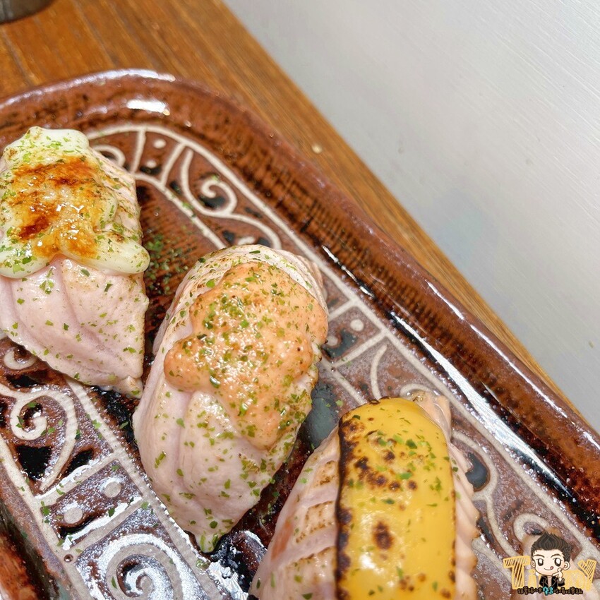 炙燒鮭魚壽司是小米最愛,炙燒鮭魚搭配明太子、玉子燒,一口咬下有滿滿的幸福感