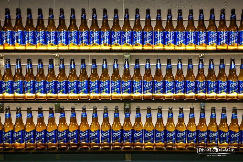 牆上以CASS啤酒和風味系列燒酒空瓶裝飾,一整排壯觀吸睛。