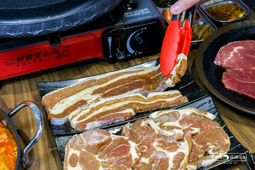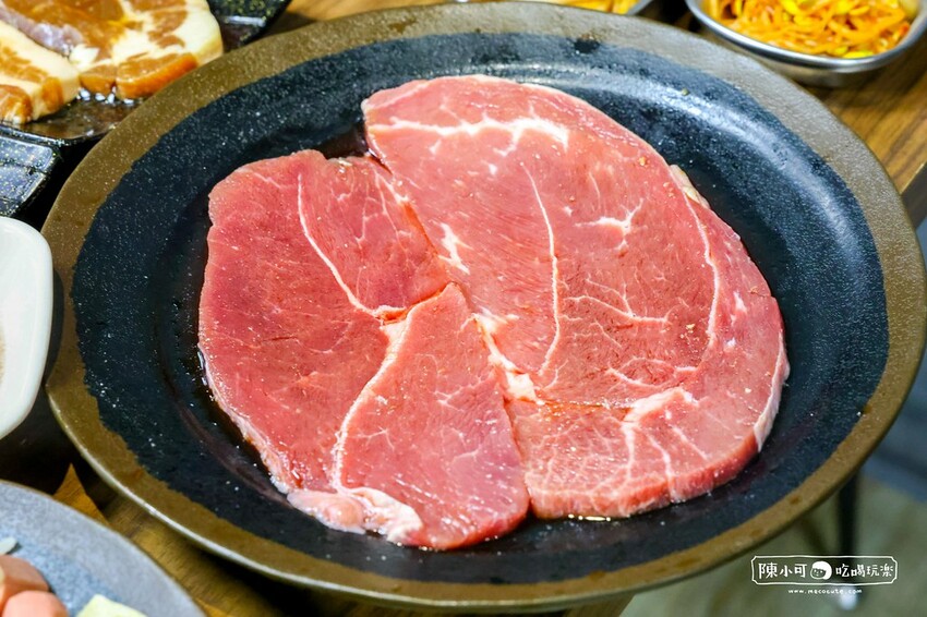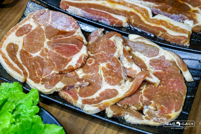 兩種都醃製過的豬肉片,肉質厚實又嫩,我偏愛帶有油脂較多的豬五花,單吃、配泡菜或包生菜都推薦,沒有醃過的厚片牛肉,帶嚼勁且鮮嫩多汁。