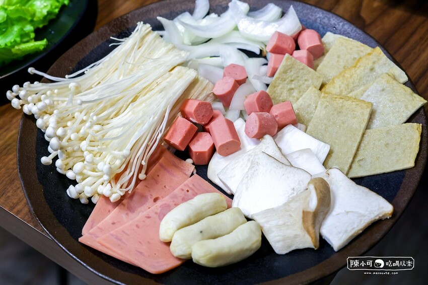 邊吃邊看食材,有韓國年糕、韓國泡麵、韓國魚板、肉片、豆腐、金針菇、杏鮑菇、甜不辣、貢丸、高麗菜、起司片和魚丸等, 相當豐富。