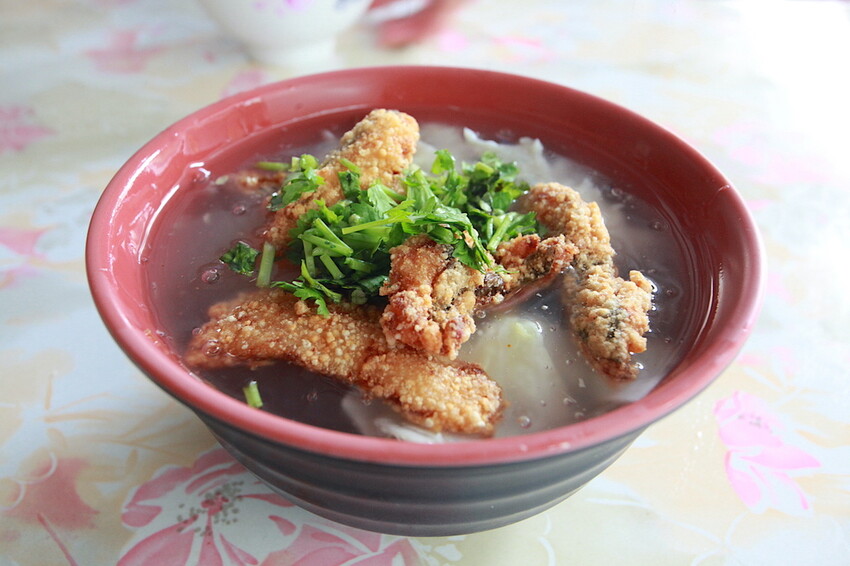 店家羹湯是以虱目魚焿為基底,表面再鋪上𩵚魠魚就完成餐點。