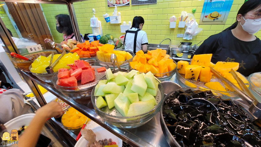 一邊是撈秤重的冰品食材,一邊是做雪花冰或果汁的櫃台,分成兩邊我真的搞不懂