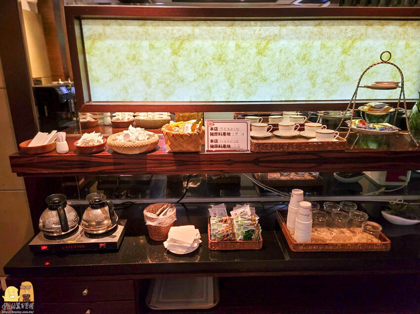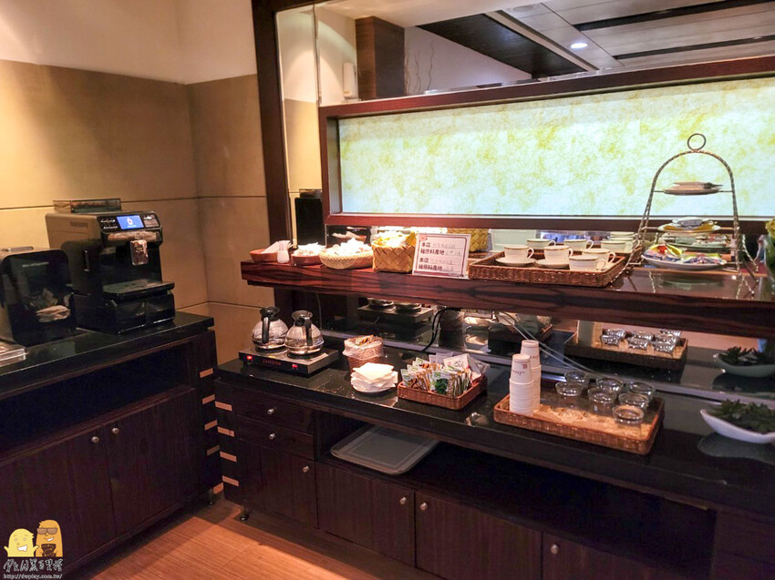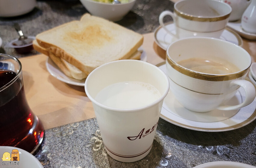 這邊有提供咖啡以及茶品可供飲用,沒有豆漿或牛奶可以自己裝,不過有需要的話可以跟服務員說,他們還是會提供