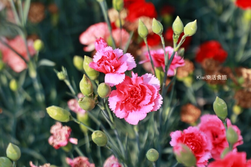 田尾董家花田的園區中百花齊放好美,康乃馨花海太美讓我們就這樣拍起照來,沒想到康乃馨的色彩也太繽紛,紅、粉、橘、桃紅~都好美呀!
