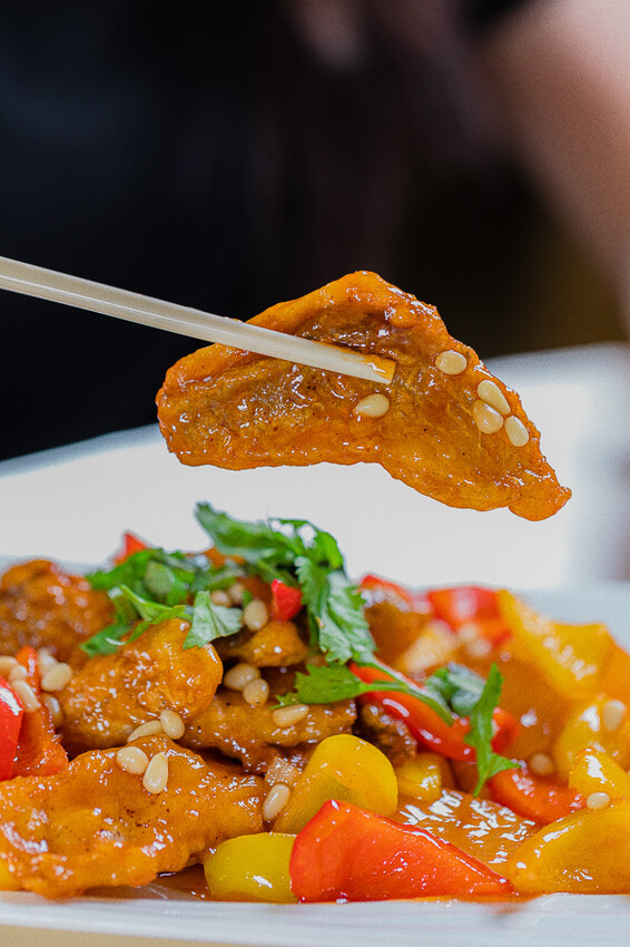 ▲▼這道菜比較類似糖醋料理,每一塊鱸魚都非常大塊,主廚很貼心的去除魚刺,讓大家可以爽快的大口咬下,表皮還保有清脆的口感,麵衣吸附滿滿糖醋醬汁,經過高溫油炸後讓魚肉較為紮實,整體是酸甜飽口,鮮魚的鮮甜感十足,搭配上松子,那堅果的奶香是讓整個風味更佳濃郁了呢