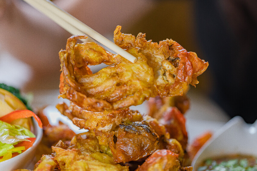 ▲▼軟殼蟹沾滿酸甜的泰式醬汁,還是依舊酥脆呢,酸甜滋味加上外酥內軟的口感,這道很適合當下酒菜啊哈哈,酥炸軟殼蟹份量很大,剛好可以搭配沙拉來轉換口味。
