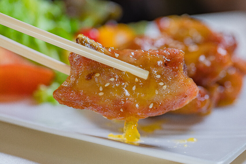 ▲▼特地選用高級的伊比利豬,選擇的部位骨頭較少,一樣是可以大口吃肉啦!橙汁的果香芬芳啊~可以感覺得出這是使用肥瘦比例恰到好處的~鮮甜感依舊令人滿意,Q彈保有咀嚼感的美味與醬汁完美組合,就算大家一直喊著飽到天頂蓋,大家還是一口一口吃啊~嘴巴說好飽但貪吃的心卻很誠實呢~
