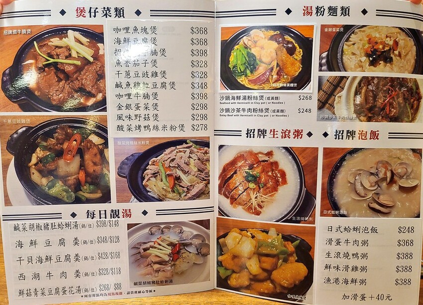 小炒 、現場麵飯 、港式燴飯 、煲仔菜類 、湯粉麵類 、招牌生滾粥 、招