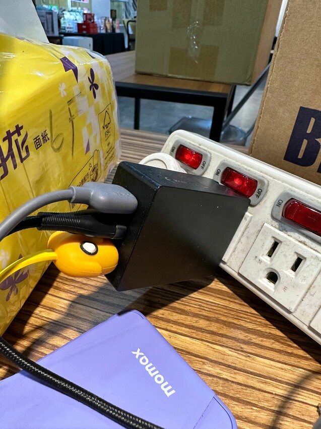 出門在外或是在辦公室工作,只要有一顆三口充電頭,就可以同時充筆電、鍵盤、手機,也因為充電頭比較大顆一點,像這種咖啡廳桌邊的插座,光插一個充電頭就滿了