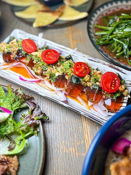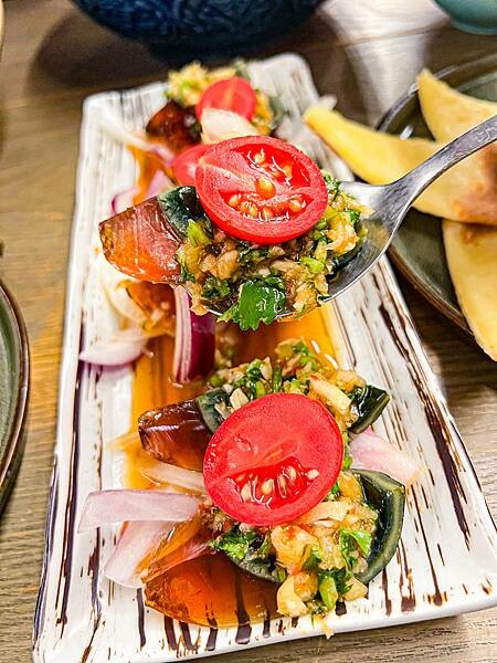 清爽前菜超開胃,涼拌皮蛋我自己超喜歡吃皮蛋搭配生洋蔥、辣椒、蒜頭、香菜等製作的醬汁,酸辣而且帶著嗆辣的風味衝進鼻腔整個很過癮耶!怕辣的可能會不敢嘗試~但我覺得嗆辣的香氣吃起來爽度很夠,跟皮蛋搭配香氣中和後很有豐富的層次感!