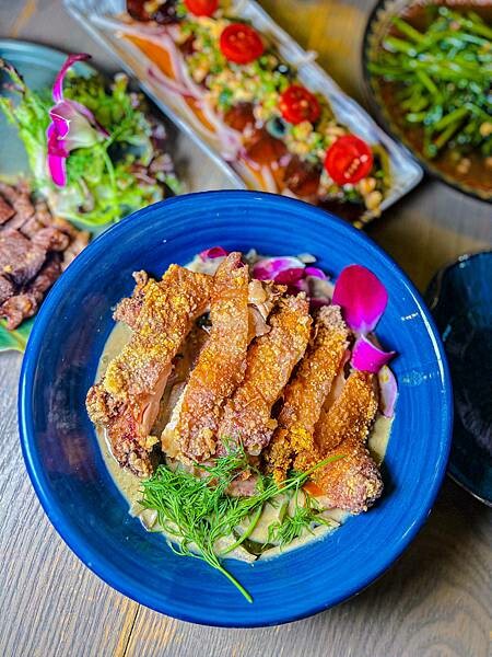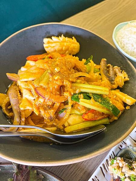 椒麻雞與綠咖哩結合!這樣搭配還不錯耶~通常綠咖哩就是搭配嫩雞,這兩樣我都很喜歡搭配起來也很適合呢椒麻雞很酥脆金黃外皮不油膩內裏的雞腿肉很嫩!綠咖哩的香氣很順口甘美~也是超下飯的,搭配泰國香米飯真的是絕配啊
