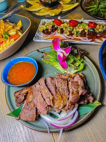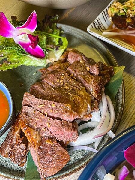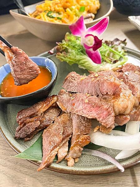 這道推推很可以點!擺盤很精緻,烤的熟度剛好的牛肉,這個部位的肉質口感很棒~軟嫩鮮美越咀嚼越香!單吃就好好吃也可以沾上特調泰式風味醬,微酸辣的風味也很對味,吃起來很清爽