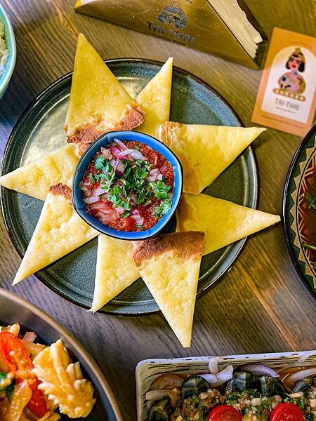 這道是新菜色很特別!造型很像月亮蝦餅~烤餅口感帶點嚼勁越咀嚼餅皮的香氣越香,搭配上頭一層起司身為起司控我超喜歡!起司的奶香濃郁再搭配泰式莎莎醬帶點微酸,香氣中和起來很有層次感~讓人一片接著一片耶!