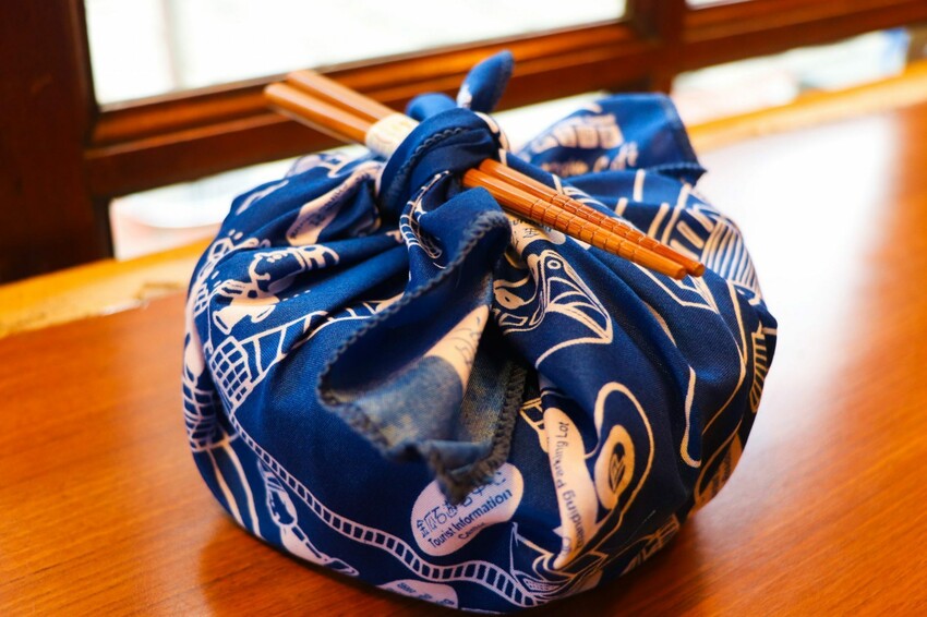 ▼吃完便當後,還可以把便當盒、包巾(上面還印有九份金瓜石地圖)以及竹筷子帶回家當紀念,是不是非常值回票價呀!
