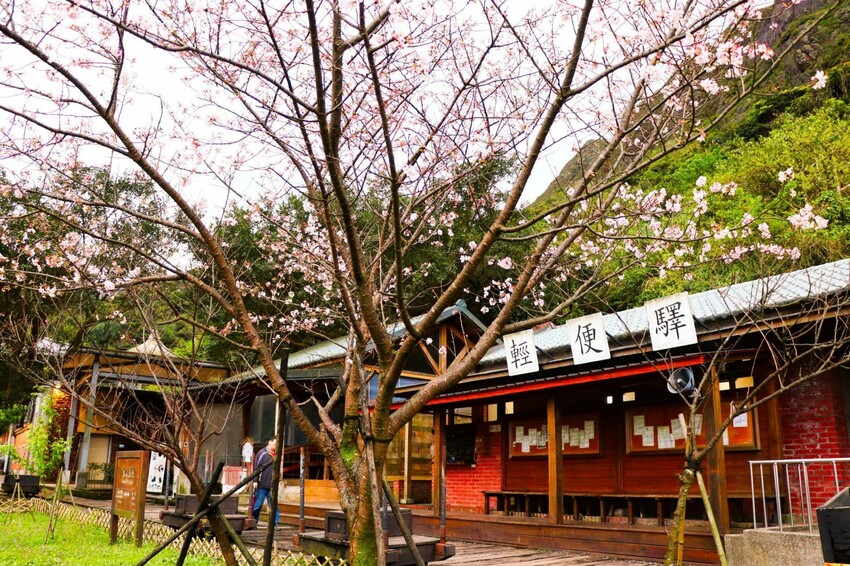 另外前往黃金館的路上,大家可以注意一下腳底踩著的鐵軌,再往前走一點,抬頭可以看到一個小車站「輕便驛」。這條輕便車道原本是建來運輸礦工器材、物資、礦石等,雖然這條軌道已經不能使用,但園區特別保留了部份舊有軌道作為園區的步道。無論是保留下來的車站風貌以及懷舊公告,還是鐵軌與枕木的氛圍,再配上三月初開的櫻花樹,都不禁讓人覺得這裡不是台灣吧!?