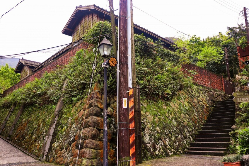 首先在爬往黃金館的路線共有三條,其中在金屬工藝館對面的這條石階步道,令小編忍不住停下腳步了!從石階口的木製老電線桿配上老房舍為背景,到階梯上紅磚瓦牆與略帶青苔的石階,一切都猶如造景般,將時間拉回到了昭和時代,不知不覺中手中的相機也捕捉了不少畫面。