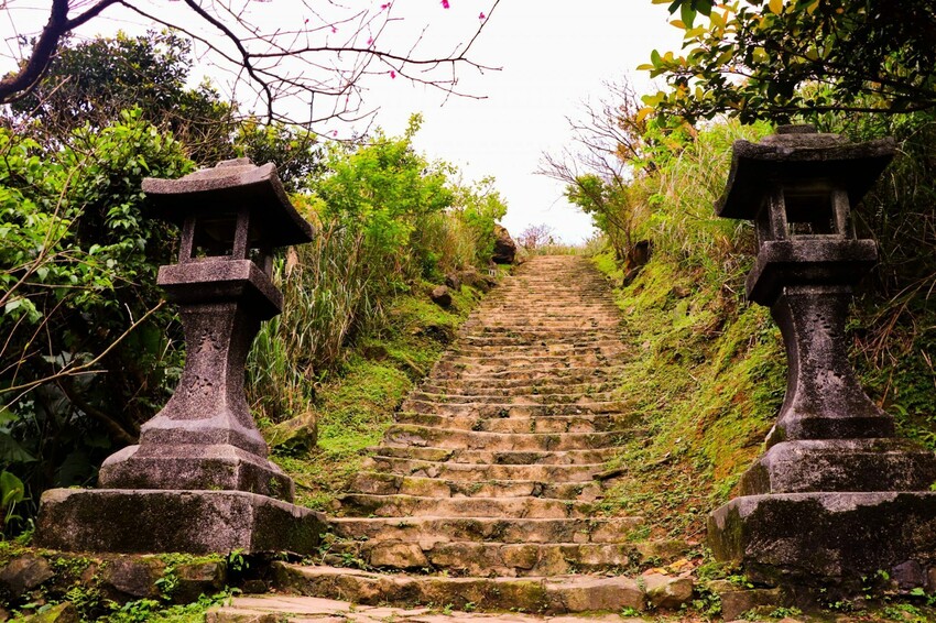 最令人難以置信的就是台灣也有「神社」?沒錯!最後逛完黃金博物館園區,一定要上來這個金瓜石神社(黃金神社)朝聖一下,這裡還有真正日本人蓋的「鳥居」!神社現址推測落成於昭和時代,但很可惜因戰後遭到破壞,現在僅留下兩座鳥居、部分的石燈籠、社殿的地基以及樑柱,儘管如此,這裡依然是黃金博物館園區內網美、網友們必來的打卡景點喔!另外站在這裡所看見的山景、海景也是金瓜石不能錯過的景色。