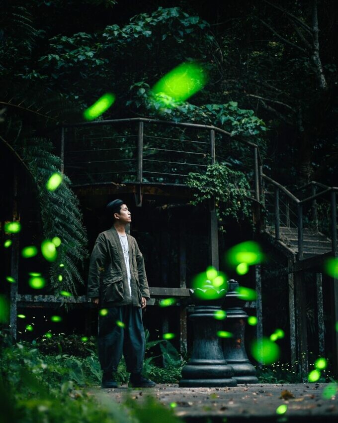 - 若想捕捉螢火蟲飛舞的景象,請關閉閃光燈,使用腳架,光圈調至最大,至少10秒以上的曝光,使用低速快門(Slow Shutter)的方式拍攝。