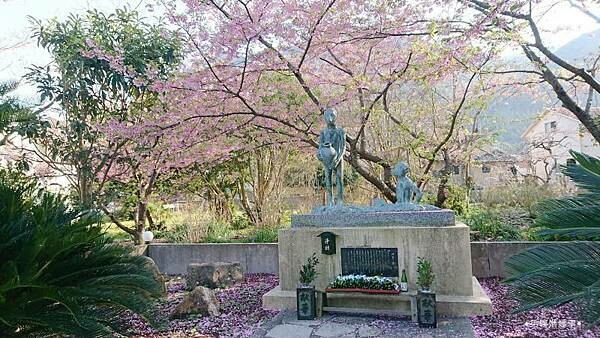 出了河津站,就先往栖足寺前進,沿途經過的橋,雖然河床的草乾枯,但搭配一旁的櫻花樹、藍天景色依然優美
